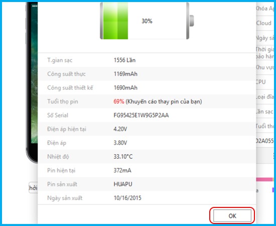 Tải 3uTools về máy tính -> Mở 3uTools và kết nối iPhone với máy tính -> Xem Số lần sạc và Tuổi thọ Pin tại giao diện -> Chi tiết để xem chi tiết tình trạng Pin -> OK.